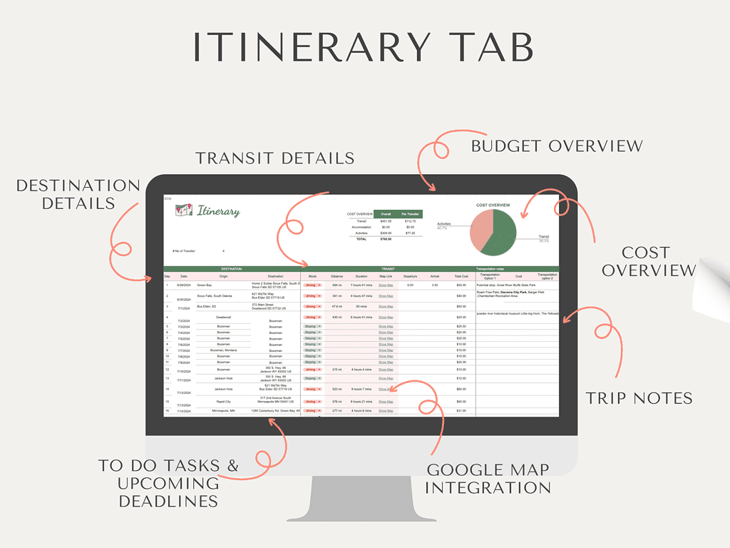 - Break your trip into manageable segments with day-by-day breakdowns for activities, meals, and travel time.